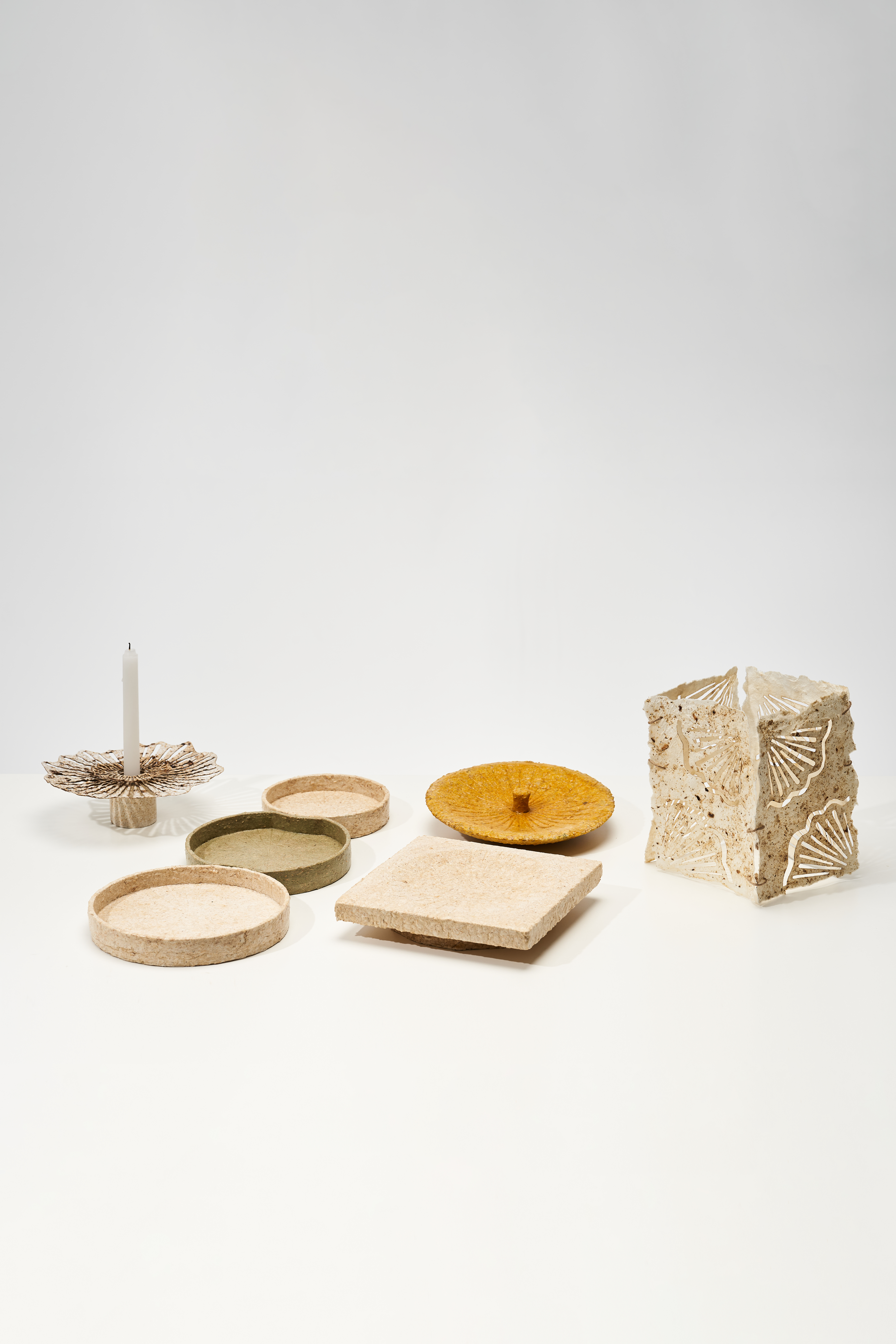" We make an eco-friendly tray with the motif of relics and make a candlestick with paper made from mushrooms grown directly. "