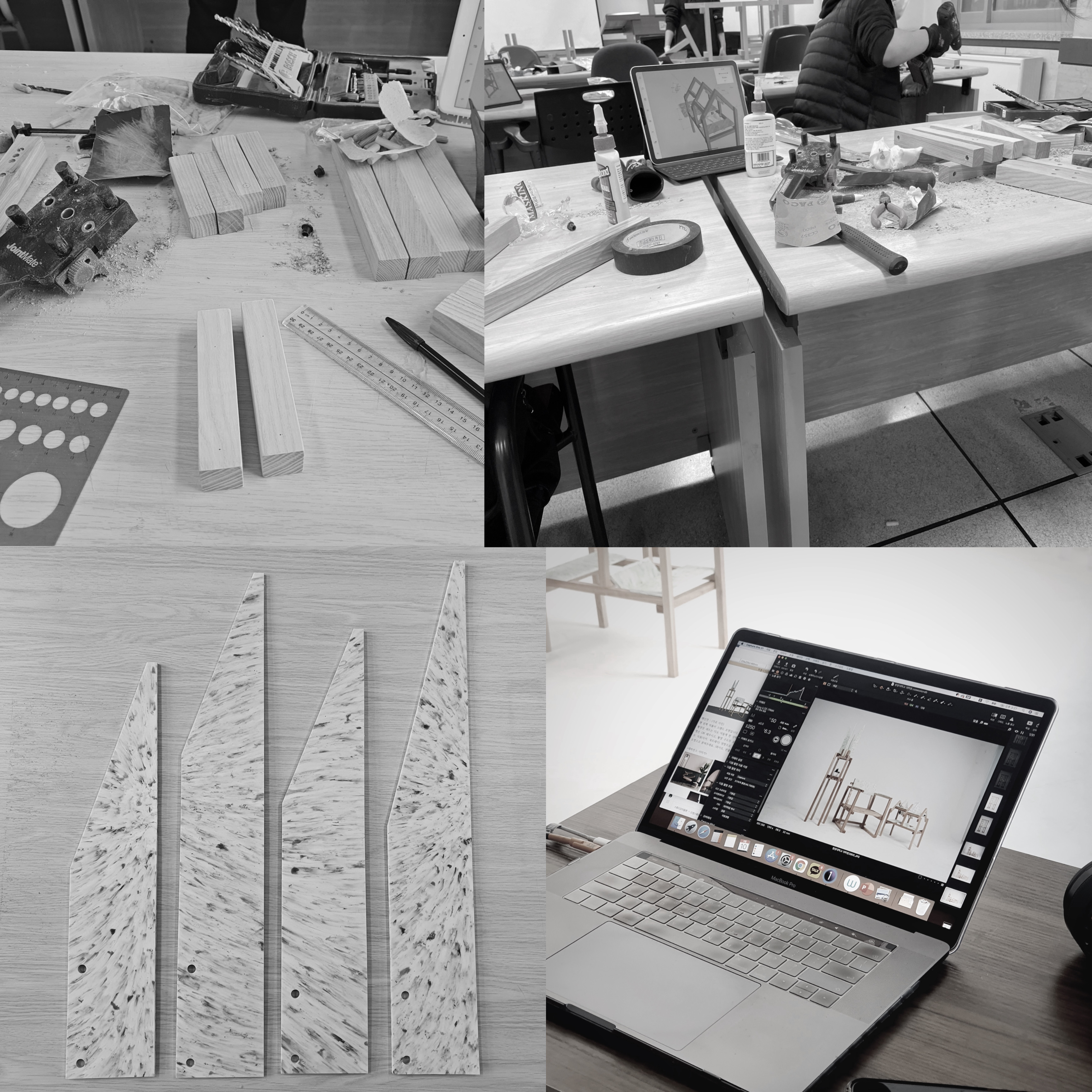 접합 부문을 도웰키트와 전동드릴을 사용하여 원형 타공하고 목심을 박아 조립했다.