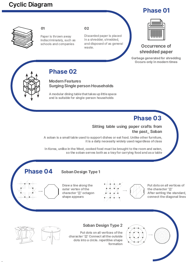 The process was simple but time-consuming in three stages. Collect the discarded posters, grind them in a straight shredder, and organize them for a long time. After that, they were sorted by color, and the round plate's abacus showed the area in a curved shape by extending the crushed paper and rolling it in a round shape.