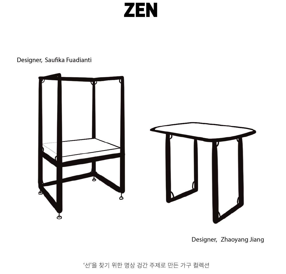 선(禪)은 사람들의 마음을 세속으로부터 벗어나 정신세계에 집중하는 자신으로 들어가 '무아' '본심' '나'을 찾아서 선의 세계에서 우리 마음 속 최초의 모습을 찾는다. 명상 통해서 선을 찾을 수 있으며 멍상 공간 주제 따라서 의자랑 테이블을 만들어 자연 요소 패턴들을 들어갔다.