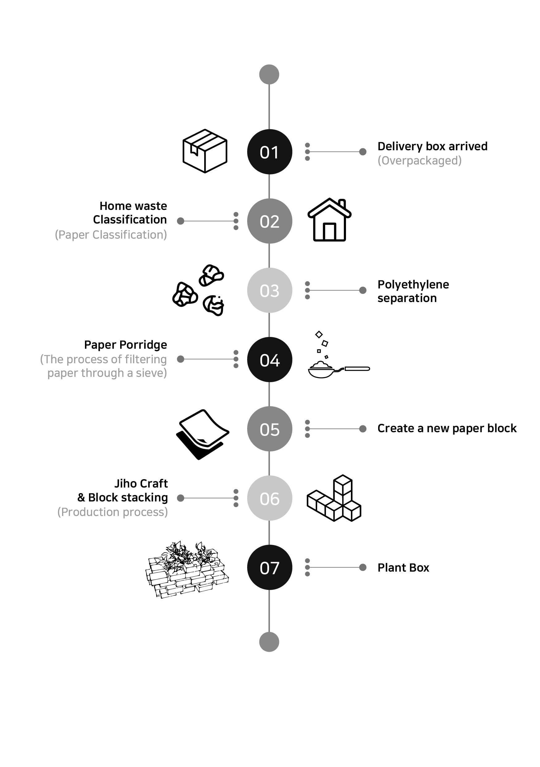After COVID-19, people spent less time going out and became accustomed to indoor life. Therefore, plants and furniture were combined so that they could heal naturally indoors. The delivery box was processed and transformed into a paper