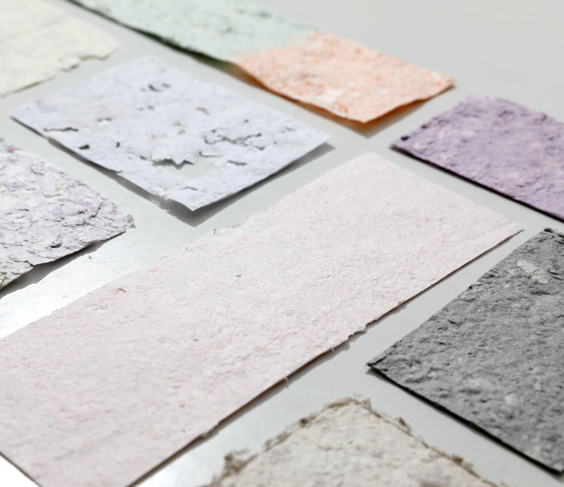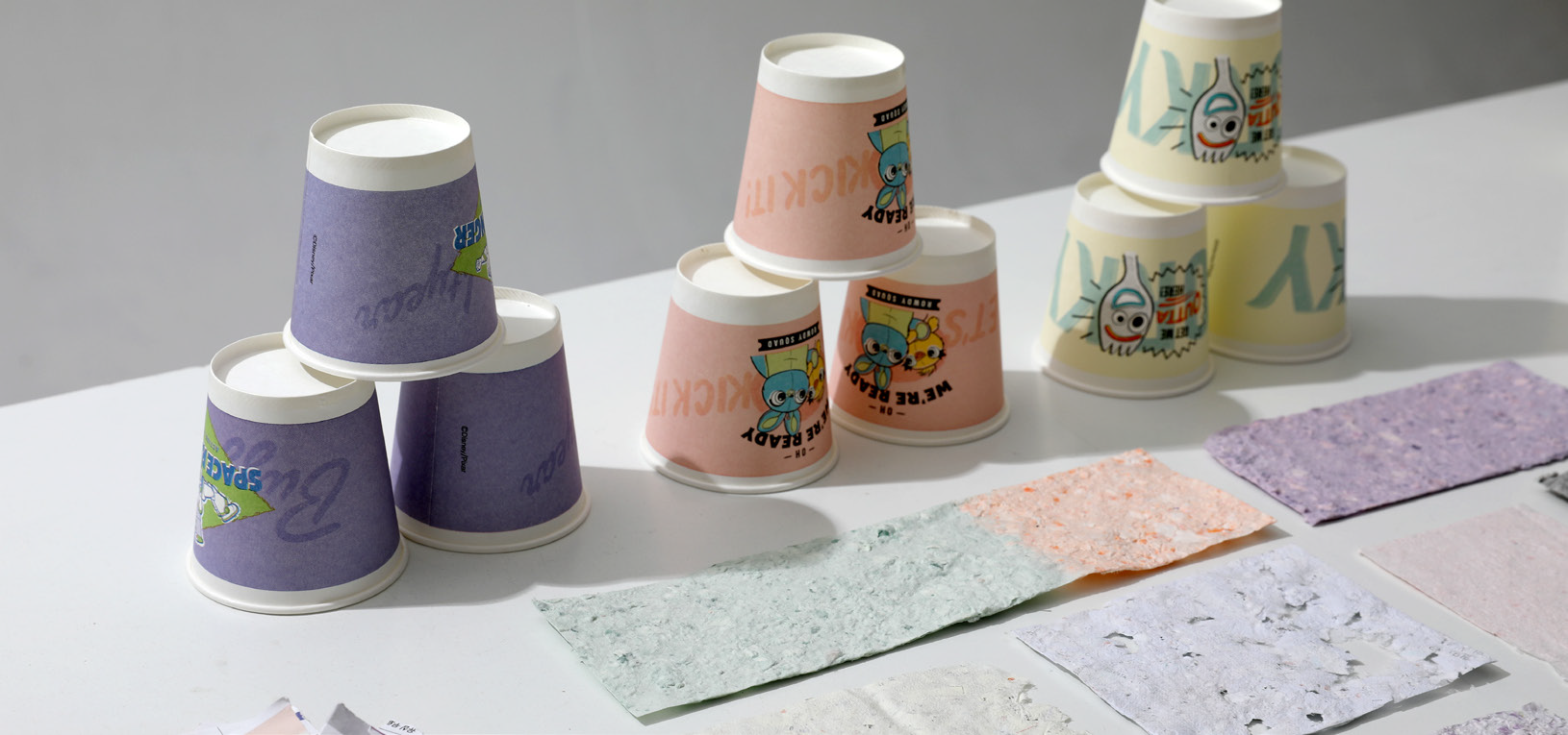Soak a paper cup in water to separate paper from polyethylene. Then, put the mail in a paper cup and tear it by hand. Pour paper porridge into a cloth to separate water and paper. Cover it with a cloth and press it with a sponge to drain it. Dry it for 12 hours to make new paper from paper cups and mail.